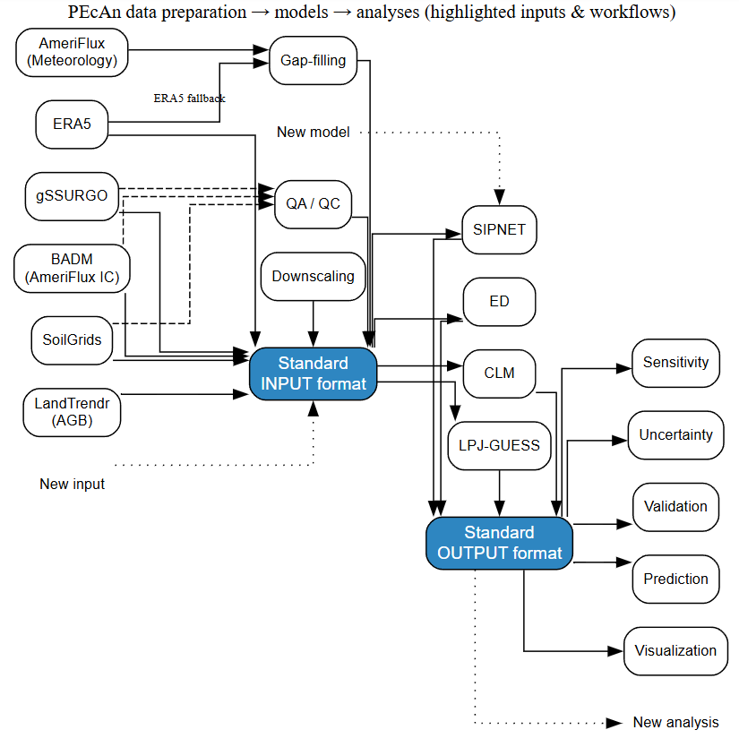 The Predictive Ecosystem Analyzer (PEcAn) is an open-source framework designed to make ecosystem modeling more accessible, transparent, and reproducible. It serves as an ecoinformatics toolbox, providing structured workflows that integrate with various ecosystem models to streamline data synthesis, uncertainty propagation, and ecological predictions.